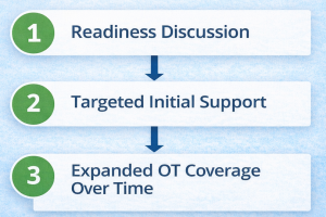 Engagement is intentionally structured to be low-friction. Most organizations start with a focused scope rather than a large commitment, allowing teams to build familiarity and confidence before expanding support.